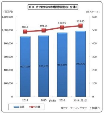 発表によると、16年度のゼロ・オフ飲料市場は、金額ベースで前年度比 4.8%増の 9644 億5000 万円、数量ベースで 同4.5%増の 5億 2095 万ケースだった。
