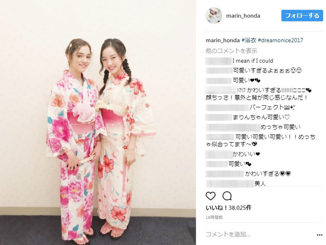 本田選手は17年7月11日、「浴衣」「dreamonice2017」のハッシュタグを付けてインスタグラムにメドベージェワ選手との写真を公開した。本田選手の浴衣は赤、メドベージェワ選手はピンクを基調としており、メドベージェワ選手の両手には扇子が握りしめられている。このまま花火大会にでも行けば、すれ違う人たちの視線を独り占めしそうだが、そんな2人の美貌には、インスタグラムのコメント欄で