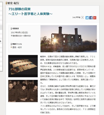 番組は「731部隊の真実 ~エリート医学者と人体実験~」と題して8月13日に放送され、17日未明に再放送された。番組は、ロシア国立音声記録アーカイブで発掘された1949年の軍事裁判「ハバロフスク裁判」の約22時間にわたる音声記録や、731部隊に「少年兵」として属していた人のインタビュー、京都大学などに残されていた資料などで構成。人体実験の実態や、軍からの多額の研究費の見返りに、東大や京大が多くの医師を731部隊に送り込んで人体実験を進めていたことを指摘した。