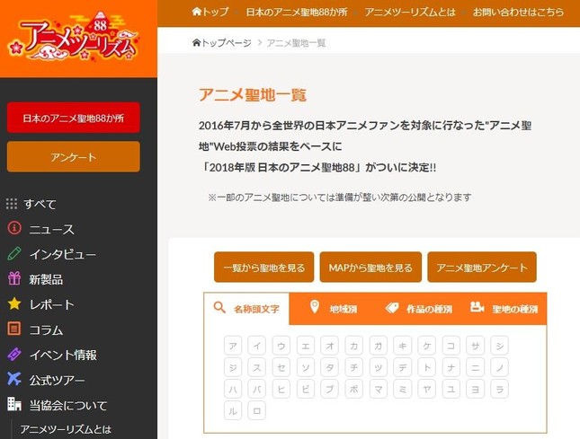 「アニメ聖地」は、作品、施設、イベントの3つのカテゴリに分けられる。「88」という数字は、「作品」カテゴリのみの聖地の数で、「イベント」「施設」を含めると110の土地がリストアップされている。