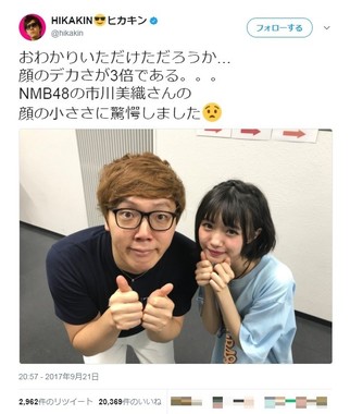 人気YouTuberのHIKAKIN(ヒカキン)さん(28)が、NMB48のコンサートツアーにゲストで出演した。メンバーたちが終演後、SNSでヒカキンさんとのツーショット写真をアップすると、「器の大きい優しいヒカキンさん」「腕がムキムキでかっこ良かった」など称賛の言葉で埋め尽くされた。