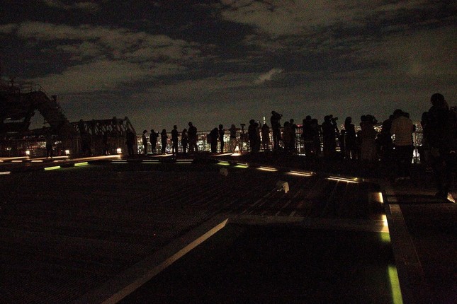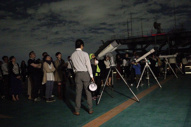 「東京シティビュー」の中でも、標高270メートルにある屋上展望台「スカイデッキ」は「都内で最も空に近い場所」として知られる。視界を遮られずに地平線を見渡せるため、都心での天文観測スポットとしても有名だ。この日は先着100名に月見団子がふるまわれ、望遠鏡をのぞきながら天文家の解説に耳を傾けていた。