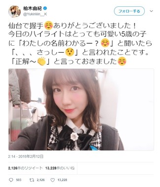 アイドルグループ「AKB48」と「NGT48」を兼任する柏木由紀さん(26)が2018年2月12日、自身のツイッターで握手会での出来事を報告した。