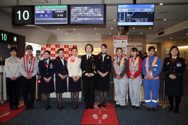 「ひなまつりフライト」が行われたのは、大分行きのJL663便(ボーイング737-800型機)。9時50分過ぎ、乗員・乗客171人を乗せて出発した。