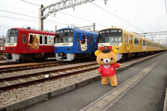 京急がリラックマのラッピング電車を走らせるのは今回が2回目。前回は赤をベースにした1編成をラッピングしたが、今回は「赤」「青」「黄」の3編成をラッピング。3編成が一堂に会するのは今回が初めてで、写真撮影には「リラックマ駅長」も駆けつけた。