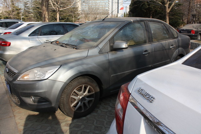 北京市内の駐車場に置かれた吉利の自動車(一番手前)。北京のような大都会で見ることは少ない