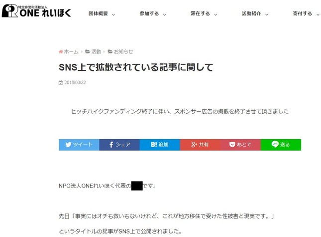このウェブ記事は、宿泊した「地方」の家で、知人女性が家主の男性から性被害を受けたことを告発する内容だ。宿泊した場所や関係者の名前、トラブルのあった時期など、詳しい情報は明かされていない。また文中には、「ONEれいほく」の名前も一切出てこない。