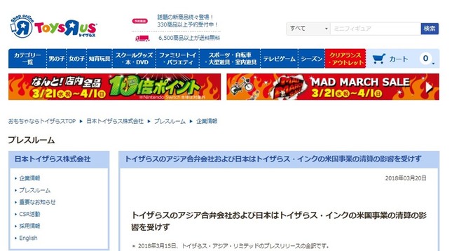 米玩具販売大手の「トイザラス」が経営再建を断念し、破産することになった。アマゾン・ドット・コムをはじめとするネット通販に吹き飛ばされた格好だ。トイザラスのアジア事業を管轄する合弁会社傘下の日本法人「日本トイザらス」は営業を続けているが、影響はないのだろうか。