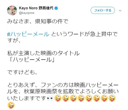 「みなさま、県知事の件で #ハッピーメール というワードが急上昇中ですが、私が主演した映画のタイトル『ハッピーメール』ですけども、とりあえず、ファンの方は映画ハッピーメールを、秋葉原映画祭を拡散でよろしくお願いいたしますです」