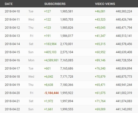 • 「SOCIALBLADE」より、HIKAKINチャンネルの登録者の増減