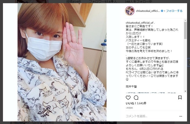 ℃-ute(2017年解散)元メンバーでタレントの岡井千聖さん(23)が、「声帯結節が再発してしまった」とインスタグラムで告白し、手術のため1週間ほど活動を休止すると明かした。