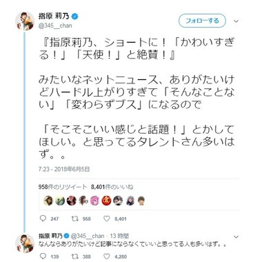 「『指原莉乃、ショートに!「かわいすぎる!」「天使!」と絶賛!』みたいなネットニュース、ありがたいけどハードル上がりすぎて『そんなことない』『変わらずブス』になるので...」