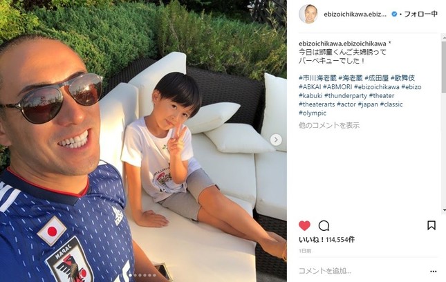 写真には、サッカー日本代表のユニホームを着用した海老蔵さんのほか、息子の勸玄(かんげん)くん、獅童さん、獅童さんの息子の陽喜(はるき)くんが写っている。