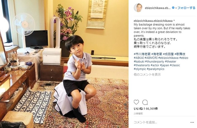 歌舞伎役者の市川海老蔵さんが2018年7月3日、息子の勸玄くん(5)に楽屋を乗っ取られそうだとインスタグラムでつぶやいた。