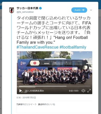 タイの洞窟で閉じ込められているサッカー少年らに向け、W杯に出場した日本代表チームが、激励のエールを送った動画を公式ツイッターに投稿し、反響を集めている。