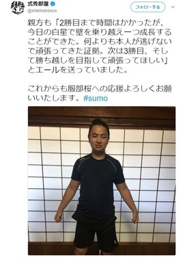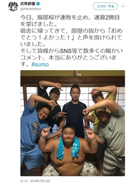 式秀部屋のツイッターアカウントは、夜になって部屋の兄弟子らが服部桜を囲んだ写真を投稿し、「部屋の皆から『おめでとう!よかった!』と声を掛けられていました」と部屋をあげて勝利を祝った。