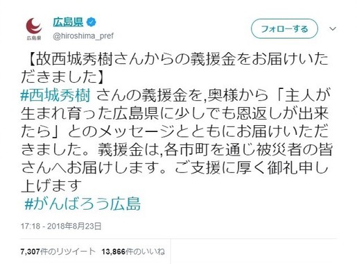 広島県が公式ツイッターアカウントを更新し、歌手で故人の西城秀樹さん名義で義援金が届いたと報告した。