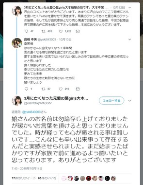 これに対し、大本幸栄さんは、「娘さんのお名前は勿論存じ上げておりましたが暖かいお言葉を頂けると思っておりませんでした」「まだ始まったばかりですが家族で前に進めるよう闘いたいと思っております。ありがとうございます」と返信をツイートした。
