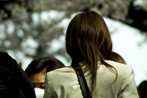 後ろから肩に手を叩くと、若い女性は「やっ!」と驚く