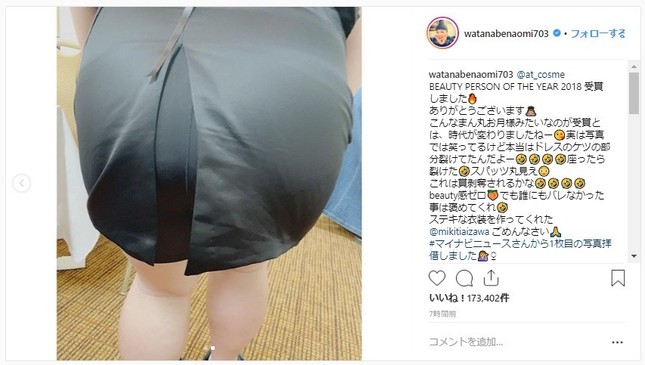 「実は写真では笑ってるけど本当はドレスのケツの部分裂けてたんだよー 座ったら裂けた スパッツ丸見え これは賞剥奪されるかな beauty感ゼロ でも誰にもバレなかった事は褒めてくれ ステキな衣装を作ってくれた @mikitiaizawa ごめんなさい」