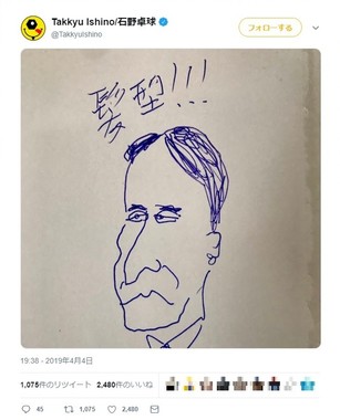 その後は、ほかのユーザーからのツイートに返信する形で更新を続けてた石野さん。質問には答えない形のフレーズをリプライし続けた後、19時26分には湾岸署を出た瀧被告の写真を付けたツイートに対し、「髪型wwww」と返信。また、19時38分には、ピエール瀧被告を描いたとみられる似顔絵に、「髪型!!!」と書き込んだ画像をツイートした。