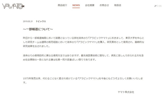 文具メーカー・ヤマト(東京都中央区)は2019年5月31日、「液体のり」が医学分野で重要な役割を果たし得ることを発見した東京大学などの研究チームの発表についてコメントを発表した。