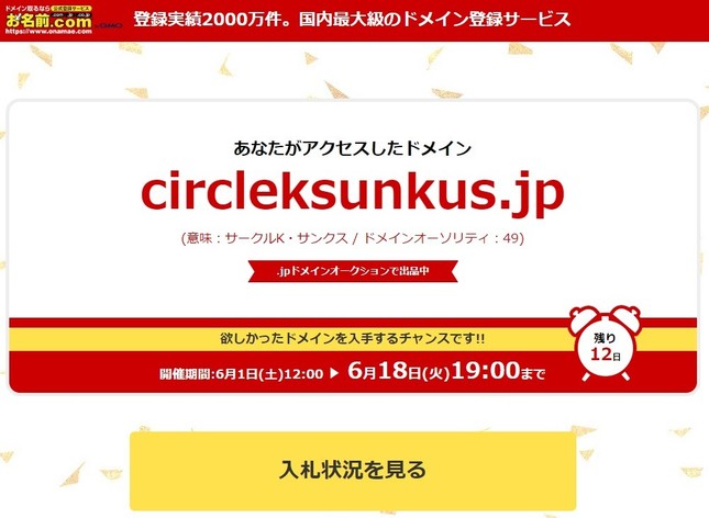 それから半年あまり、なぜドメインがオークションにかけられているのか。GMOインターネット広報は19年6月5日、「circleksunkus.jp」は4月30日に更新手続き期限が切れたと、取材に答えた。期限切れ後も、所有者が再取得できる「猶予期間」が設定されているが、これも5月1日から20日まで。6月1日からは、所有者以外でも新規登録可能になった。お名前ドットコムには、5月以前から複数の登録希望者から申請があったため、いったん取得した上でオークションを行った。