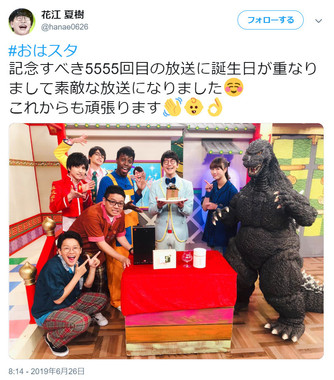 当日の放送では、「おはスタ」5555回記念ということで、背番号55番の「ゴジラ」こと松井秀喜選手が番組への応援メッセージを寄せたほか、番組内には映画「ゴジラ キング・オブ・モンスターズ」の宣伝のためにゴジラも登場し、記念日にふさわしい賑やかな内容となっていた。