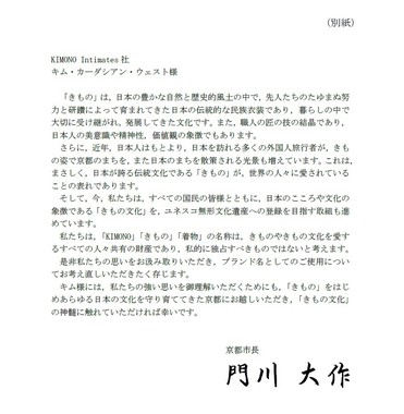 「キム様には、私たちの強い思いを御理解いただくためにも、『きもの』をはじめあらゆる日本の文化を守り育ててきた京都にお越しいただき、『きもの文化』の神髄に触れていただければ幸いです」
