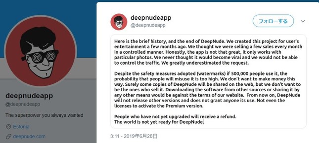 プロジェクト終了に当たって、アカウントが投稿した文章の中で、「案全対策(ウォーターマーク)を採用したにもかかわらず、もし50万人が使用したら、人々が悪用する可能性は極めて高い」と説明。作った目的について、「このプロジェクトをユーザーの娯楽のために作った」と釈明。「今後、DeepNudeはほかのバージョンを公開しないし、誰にもその使用を許可しない」とつづった。最後の方で、