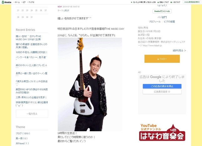 2019年7月6日に放送されている「THE MUSIC DAY 時代」(日本テレビ系)に出演した、歌手のはなわさん(42)が話題だ。