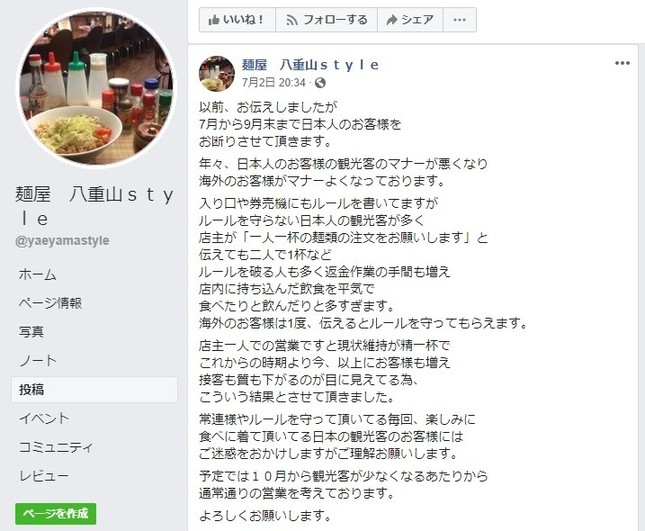 この店は、フェイスブックで5月3日、夏の繁忙期には観光客が増えて、マナーの悪い人たちの入店で営業しづらくなるとして、日本人客の入店をお断りすると告知していた。実際に7月に始め、フェイスブックでも事情を説明している。