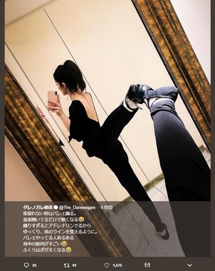 ダレノガレさんのツイートだ。これまでにも、14年11月に「家で1人バレエ...」、15年4月には「家でストレッチとバレエするよ」など、ダレノガレさんは何度かバレエについてツイートしている。日ごろの練習の賜物か、3枚目の写真で披露している「アラベスク(編注:片方の脚で立ち、もう一方の足を上げるバレエのポーズ)」は背筋が曲がっておらず、余裕をうかがわせる。