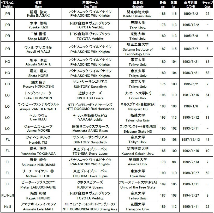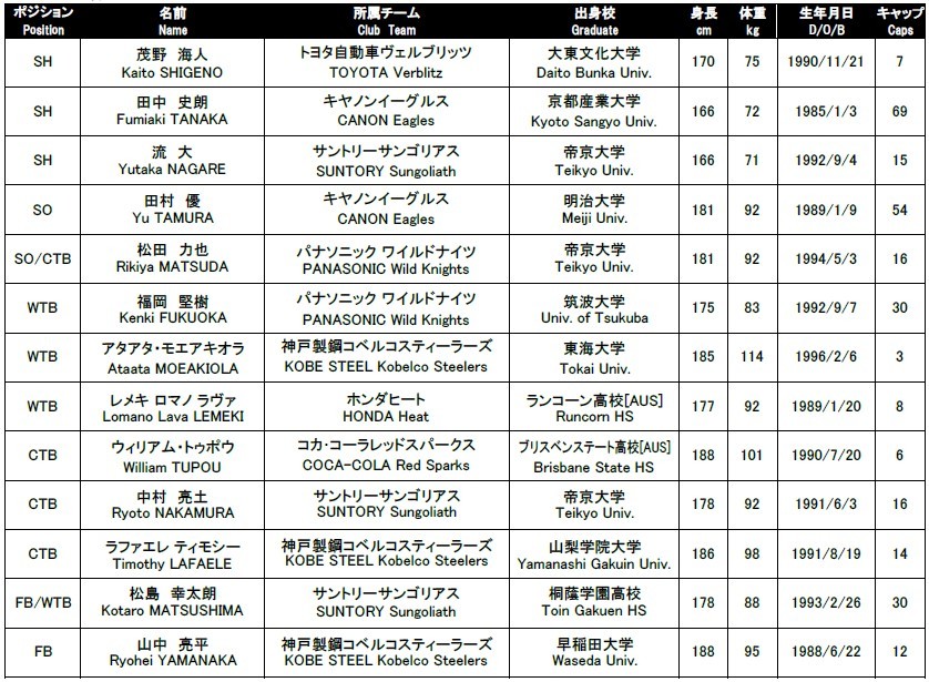 代表合宿前、ジェイミー・ジョセフHC(ヘッドコーチ)は「(いろんなポジションをこなせる)ユーティリティープレーヤーを重要視したい」という趣旨の発言をしていた。その言葉通り、FL、No.8(ナンバーエイト)で名を連ねた姫野和樹選手は、LOとして活躍した経験もある。またSO(スタンドオフ)、CTB(センター・スリークオーター・バックス)として選出された松田力也選手もそうだ。WTB(ウイング・スリークオーター・バックス)とFB(フルバック)で活躍する松島幸太朗選手は、CTBでもプレーできる。FBとして選ばれた山中亮平選手は、元々、SOの選手。ゴールキックにも定評がある。