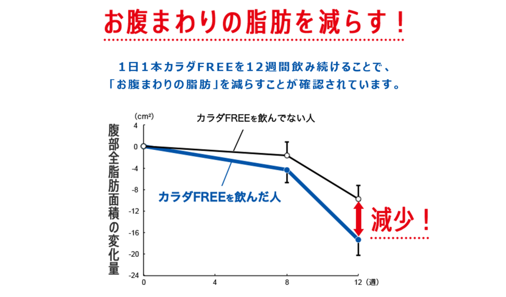 カラダFREEの機能について、キリンはヒト試験データも示している。BMI(体格指数)で肥満とされる25以上30未満の男女200人を対象に、100人はカラダFREEを、もう100人はそれ以外の飲料を、それぞれ1日1本12週間飲み続けてもらったところ、カラダFREEを飲んだ人は、飲まなかった人に比べ、お腹まわりの脂肪が減少。腹部全脂肪面積で比べると約2倍の量が減っていた。腹部全脂肪とは、内臓脂肪と皮下脂肪の合計で、内臓脂肪は一般的に食事制限や運動で落ちやすいとされ、皮下脂肪は、一度ついてしまうと落ちづらいとされている。