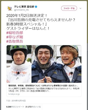 テレ東が2019年12月10日、宣伝部の公式ツイッターで3人の番組出演を告げ、サイト上のお知らせでもその内容を報告すると、ツイッター上ではこんな歓喜の書き込みが相次いだ。宣伝部のツイートは、「いいね」が2万件以上も寄せられている。