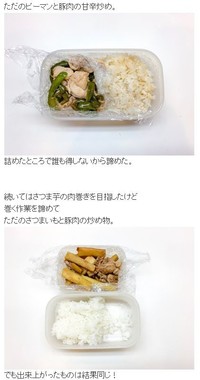 といつも通り、タッパーの半分にご飯、もう半分にラップが敷かれ、その上に置かずが置かれたおべんとう写真を公開。ホランさんの言う通り、肉詰めではなくただの炒め物になっており、ホランさんは、