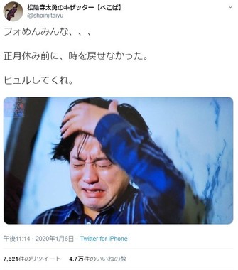 M-1グランプリ2019ファイナリスト「ぺこぱ」のツッコミ・松陰寺太勇(しょういんじ・たいゆう)さんは2020年1月6日の夜23時頃に自身のツイッターを更新した。