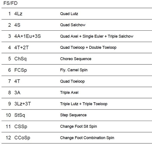 フィギュアのジャンプは高得点順にアクセル(A)、ルッツ(Lz)、フリップ(F)、ループ(Lo)、サルコウ(S)、トウループ(T)の6種類があり、コンビネーションではオイラー(Eu、ハーフループとも)というつなぎのジャンプを挟む場合もある。
