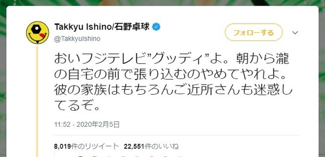 「おいフジテレビ『グッディ』よ。朝から瀧の自宅の前で張り込むのやめてやれよ。彼の家族はもちろんご近所さんも迷惑してるぞ」