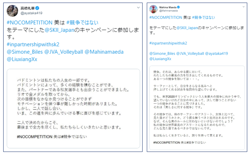 「望まない競争」とは、社会の慣習などによって発生する、個人個人に「かくあれ」と迫る圧力などを指す。特に、現代を生きる女性たちの多くは本人が望む・望まないにかかわらず、美しさをめぐる競争に巻き込まれており、その中で多くのストレスやプレッシャーを抱えるなど、日々消耗する生活を送らざるを得ない状況に置かれているとSK-Ⅱは説く。そこで、競争の美学に世界中の注目が集まる2020年のオリンピックイヤーに、SK-Ⅱは公式スキンケアブランドとしてオリンピックアスリートたちと共に「#NOCOMPETITIONキャンペーン」を展開。「#NOCOMPETITION」というメッセージの発信を通し、全世界の女性が一歩踏み出す勇気を後押しし、美しさに対する望まない競争を終わらせたいとしている。