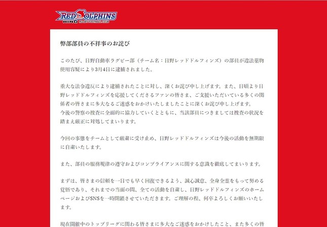 「このたび、日野自動車ラグビー部(チーム名:日野レッドドルフィンズ)の部員が、違法薬物使用容疑により3月4日に逮捕されました。