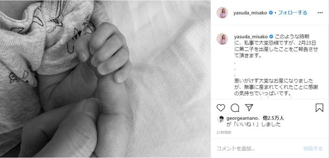安田さんは事務所の退社と同時に小さな赤ちゃんの手の写真をアップ。2月23日に第二子を出産していたことも明かし、「思いがけず大変なお産になりましたが、無事に産まれてくれたことに感謝の気持ちでいっぱいです。」とメッセージを添えている。