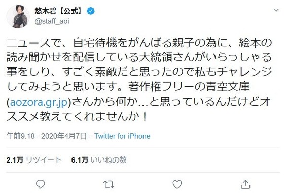 悠木碧さんは、イスラエルのリブリン大統領が自宅待機をしている親子向けに絵本の読み聞かせを配信していることを受けて、自身も読み聞かせに挑戦する意欲を持ったという。
