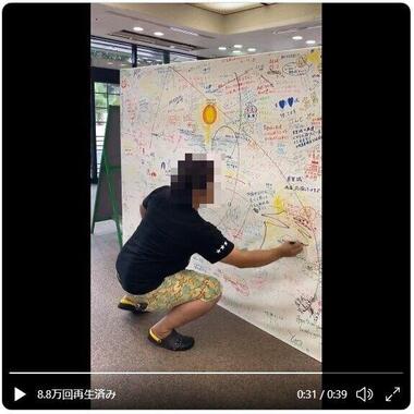 動画では、メッセージボードいっぱいに、寄せ書きの上から自身の名前とみられるサインを書き殴る様子が映っている。