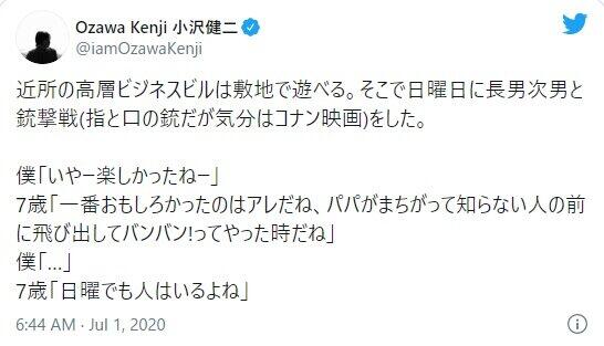 小沢さんは、「近所の高層ビジネスビルは敷地で遊べる。そこで日曜日に長男次男と銃撃戦(指と口の銃だが気分はコナン映画)をした」と、7歳の長男と3歳の次男と一緒に楽しい休日を過ごしたことを報告。