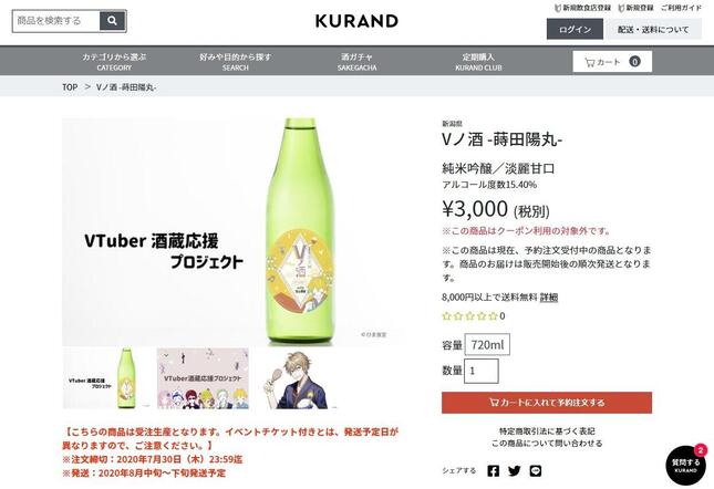 酒類オンライン販売サービス「KURAND」を運営するリカー・イノベーション(東京都台東区)は2020年6月30日、「VTuber酒蔵応援プロジェクト」を開始した。