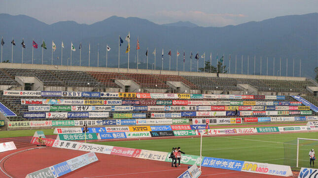 目を凝らして幕を見ると「山梨トヨペット」「アーク甲府店」のように、地元山梨にある企業や店舗とみられる名前が書かれている。そう、スタンドを埋め尽くしていたのは、企業による「広告幕」だったのだ。