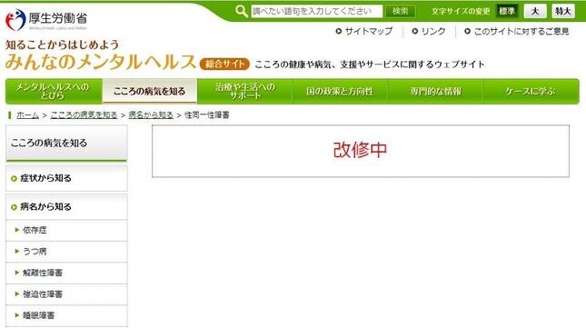 指摘があったページは厚労省の「知ることからはじめよう みんなのメンタルヘルス 総合サイト」。ここでは「性同一性障害」について「女性なのに、自分は『本当は男なんだ、男として生きるのがふさわしい』と考えたり、男性なのに『本当は女として生きるべきだ』と確信する現象を『性同一性障害(gender identity disorder, GID)』と呼びます」などと説明し、「性同一性障害とはどのような病気であるのか、その症状や治療法、法的側面等について解説します」としていた。