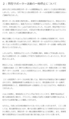 「弊社で活動していたほとんど全ての男性サポーターの皆様は大変誠実です。そのため、誠に断腸の思いではありましたが、男性サポーターの方がすでにお持ちの予約に対しては1ヶ月分売り上げ補償をするとともに、男性サポーターの活動一時停止を発表させていただきました」